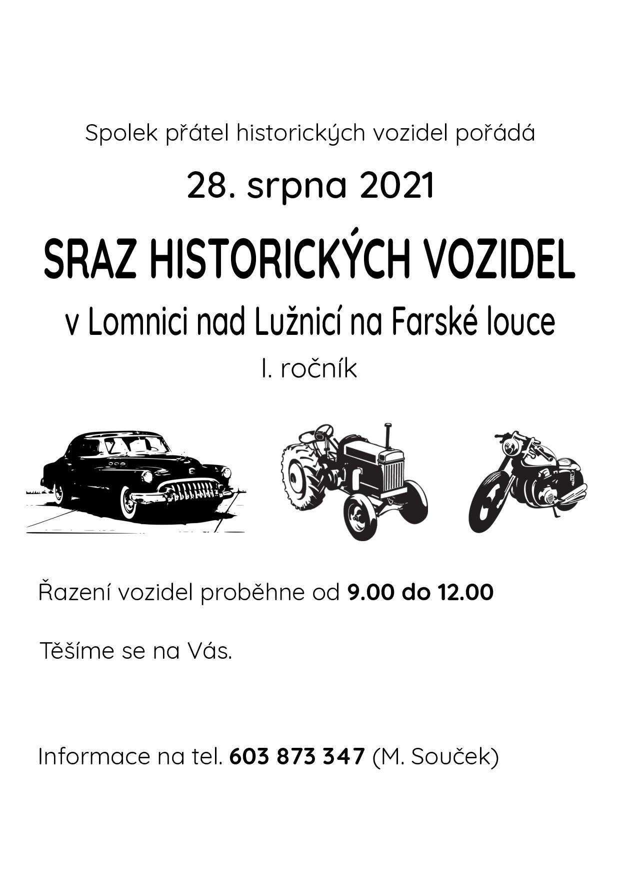 V rámci folklorního festivalu U Zlaté stoky se v areálu Farská louka uskuteční v sobotu 28. srpna od 13 hodin 1. ročník srazu historických vozidel.Těšit se můžete na auta, motorky i traktory.