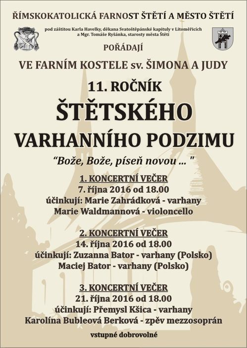 Římskokatolická farnost Štětí a město Štětí pořádají letost již 11. ročník štětského varhanního podzimu. Tři říjnové soboty po sobě, vždy od 18:00 hod. v prostarách farního kostela Šimona a Judy ve Štětí. Vstupné dobrovolné. Obec: Ústecký krajŠtětí Tweet