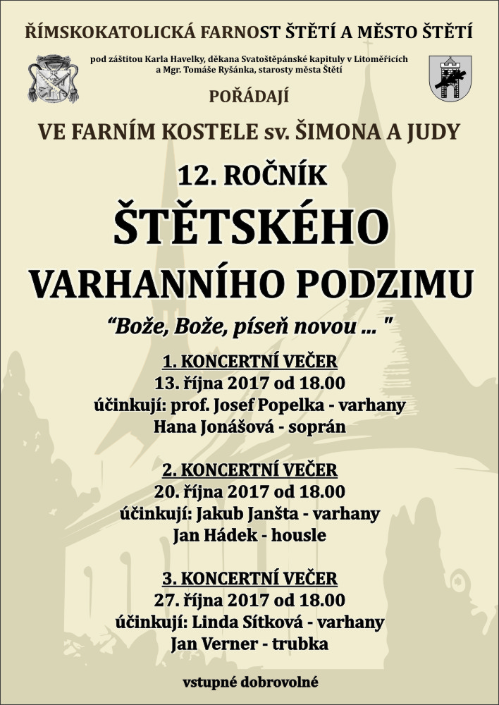 Dovolujeme si vás pozvat na 12. ročník Varhanního podzimu ve Štětí. Jako již tradičně se koncerty uskuteční ve farním kostele sv. Šimona a Judy vždy v pátek od 18:00 hod.