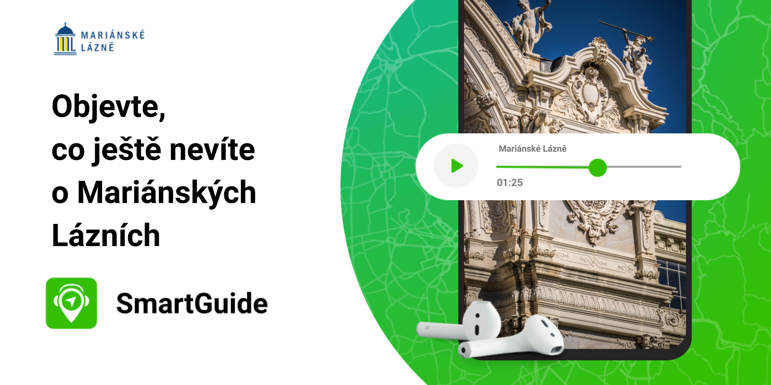 V našem průvodci najdete přehledně 17 míst, která byste neměli při návštěvě lázní minout. Můžete si je zobrazit na mapě, přečíst si o nich informace a naplánovat si, která z nich určitě chcete vidět. Samozřejmě si můžete rovnou pustit audio a při něm si třeba prohlížet fotografie a naladit se na cestu.