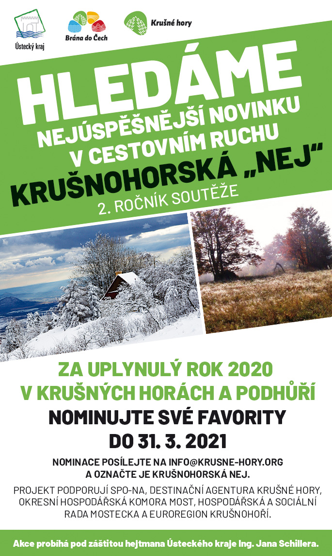 Veřejnost může opět ocenit nejvydařenější novinku v oblasti cestovního ruchu v Krušnohoří. SPO-NA, sdružující Destinační agenturu Krušné hory, Okresní hospodářskou komoru Most, Hospodářskou a sociální rady Mostecka a Euroregion Krušnohoří, vyhlásila soutěž Krušnohorská NEJ za rok 2020.