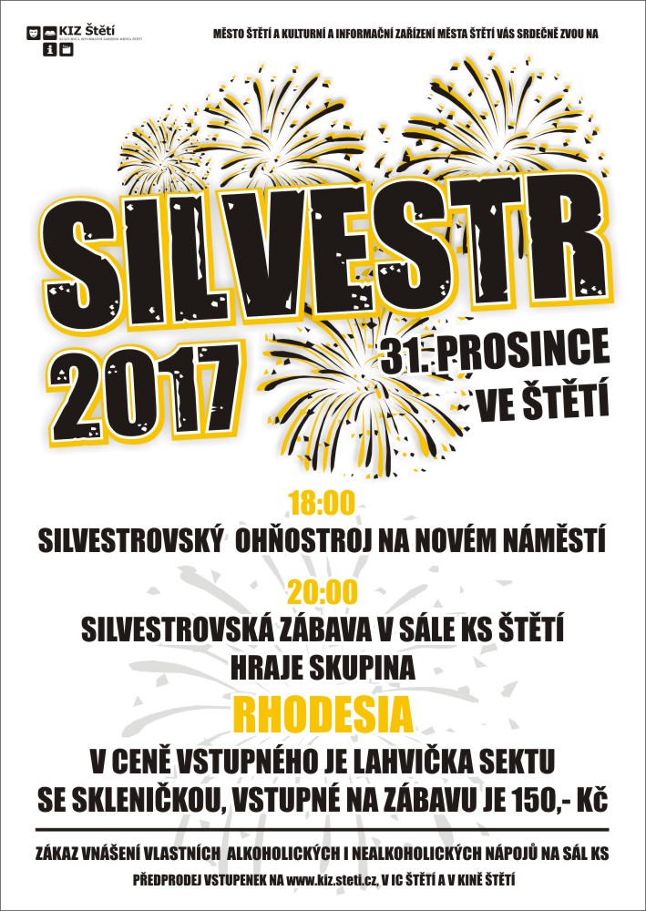 Přijďte společně s námi oslavit konec starého roku a příchod toho nového. Jako již tradičně se od 18:00 hod. uskuteční na Novém Náměstí ohňostroj, po kterém bude od 20:00 hod. následovat taneční zábava na velkém sále KS ve Štětí. K poslechu i tanci zahraje skupina Rhodesia.