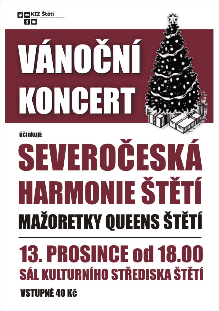 Srdečně Vás zveme na Vánoční koncert města Štětí! Akce proběhne dne 13. prosince na sále Kulturního střediska. Začátek je v 18:00 hod.Učinkovat bude Severočeká harmonie Štětí a mažoretky Queens. Vstupné 40,- Kč Obec: Ústecký krajŠtětí Tweet
