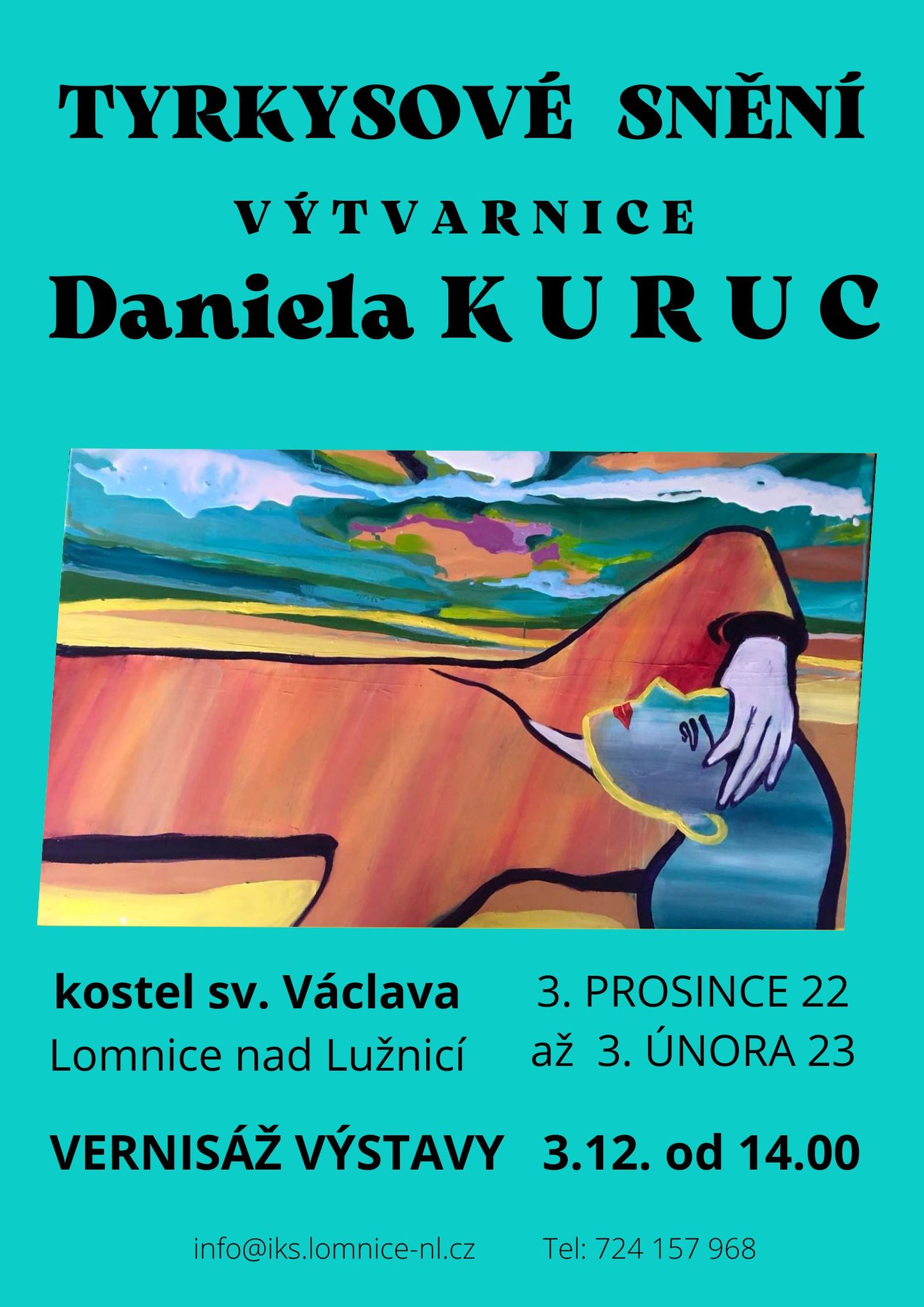Zahájení výstavy obrazů od výtvarnice Daniely Kuruc s názvem TYRKYSOVÉ SNĚNÍ proběhne v sobotu 3.12. ve 14 hodin v kostele sv. Václava v Lomnici nad Lužnicí.Výstava potrvá do 3.2.2023.