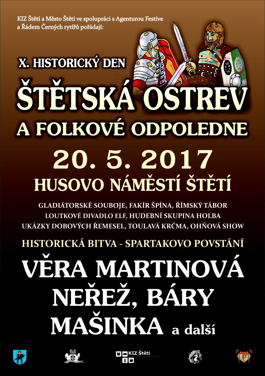 Dovolujeme si vás pozvat na již desátý historický den města Štětí, který proběhne v sobotu 20. května tentokrát v duchu Spartakova povstání. Akce se uskuteční na Husově náměstí, kde již od dopoledních hodit můžete shlédnout ukázky dobových řemesel, výcvik gladiátorů, římský tábor, loutkové divadlo a historické hry. Po poledni se pak uskuteční samotné Spartakovo povstání. Odpolední program si zpříjemníme poslechem hudby a celou akci zakončí ohnivá show, která proběhne v 22:00 hod.