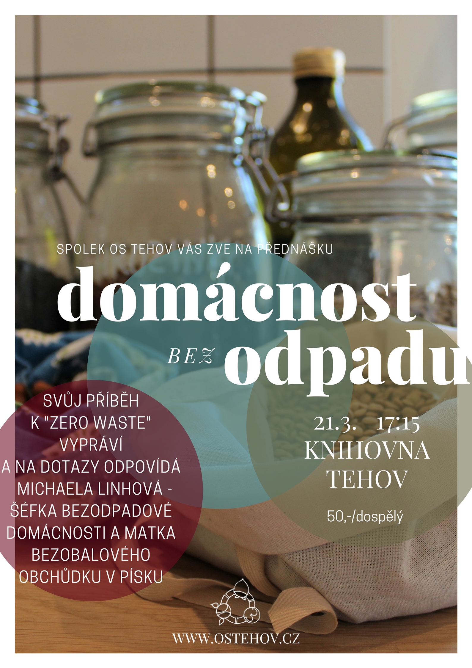 "Život bez odpadu - šetrné nakupování"Jak žít bez zbytečného odpadu, jednoduše šetřit přírodu i vaši peněženku. Svůj příběh k "zero waste" vypráví a na dotazy odpovídá Michaela Linhová - šéfka bezodpadové domácnosti a matka bezobalového obchůdku BEZ v Písku.středa, 21. březen 2018, od 17.17, knihovna Tehov