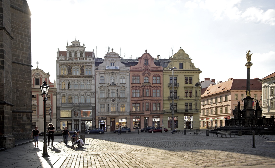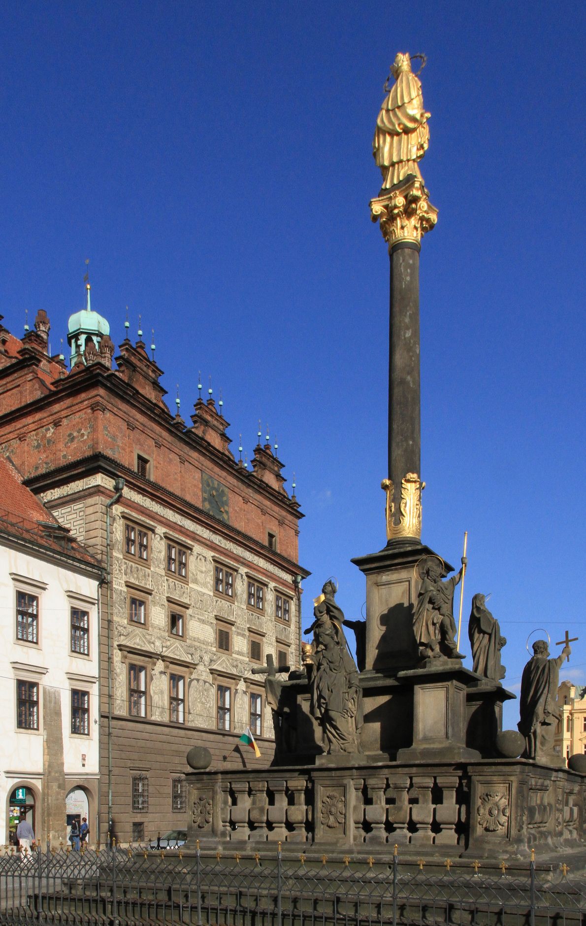 Renesanční radnice postavená podle plánů italského stavitele Giovanniho de Statia v letech 1554–1559 patří k nejkrásnějším radnicím v Čechách.V zadní části mázhauzu radnice se nachází plastický model historického jádra města. Morový sloup mezi radnicí a katedrálou je dílem plzeňského sochaře Kristiana Widmana z roku 1681.
