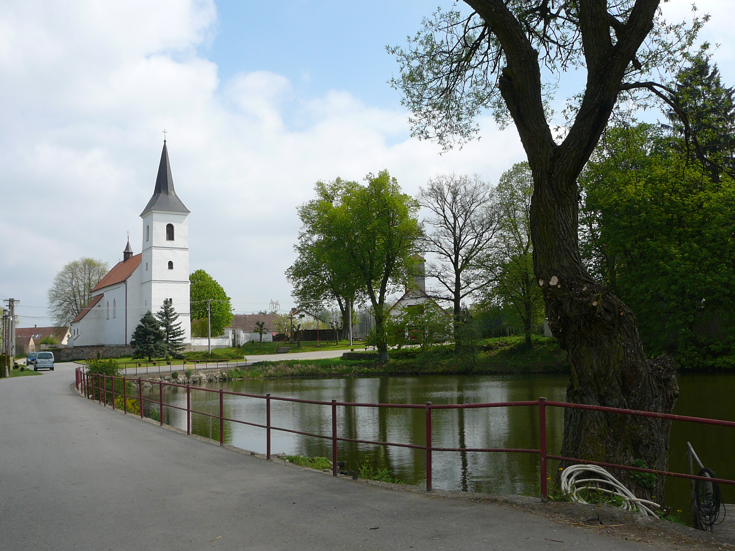 Náves jako z Ladových obrázků – rybník, vrba, kostel, zbrojnice…