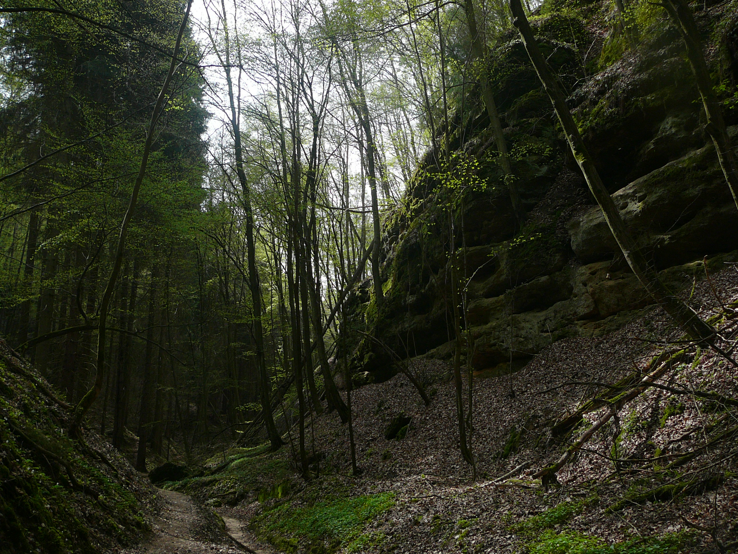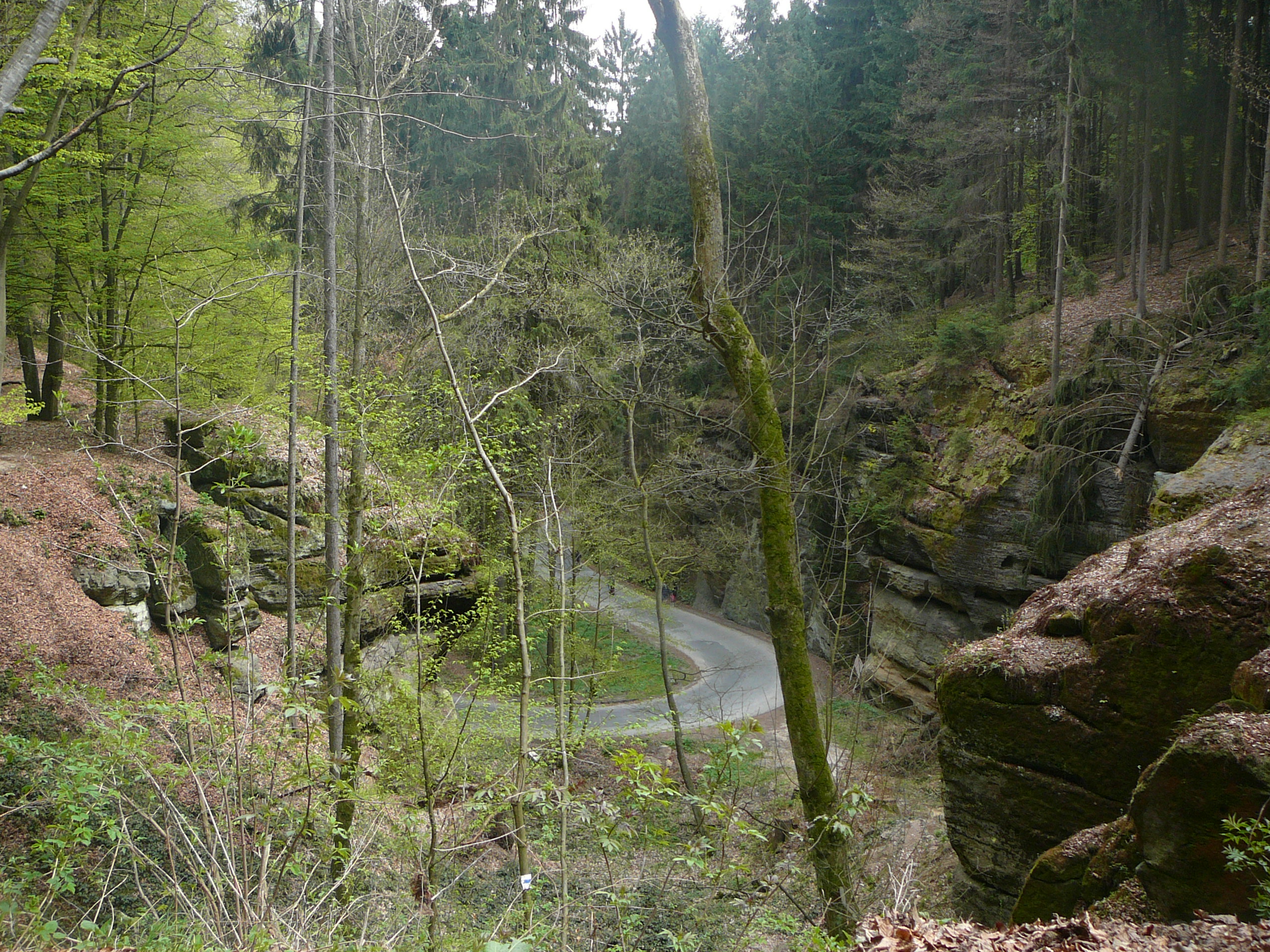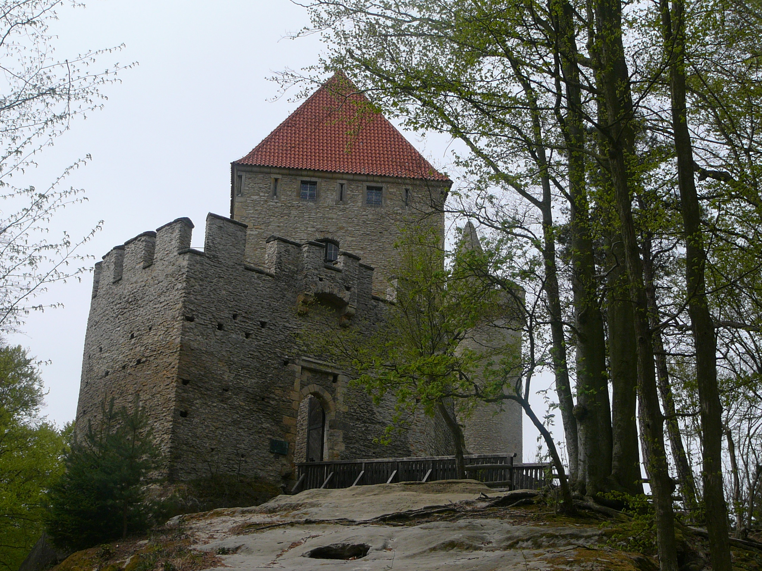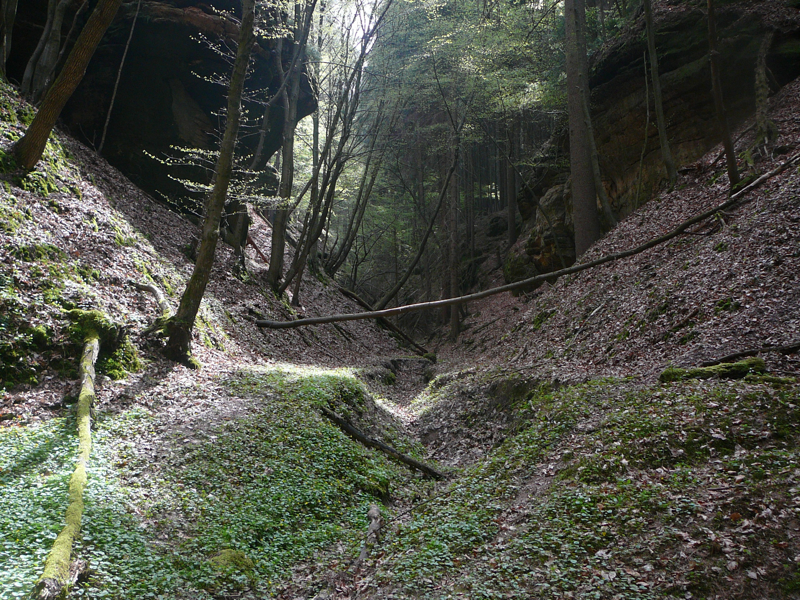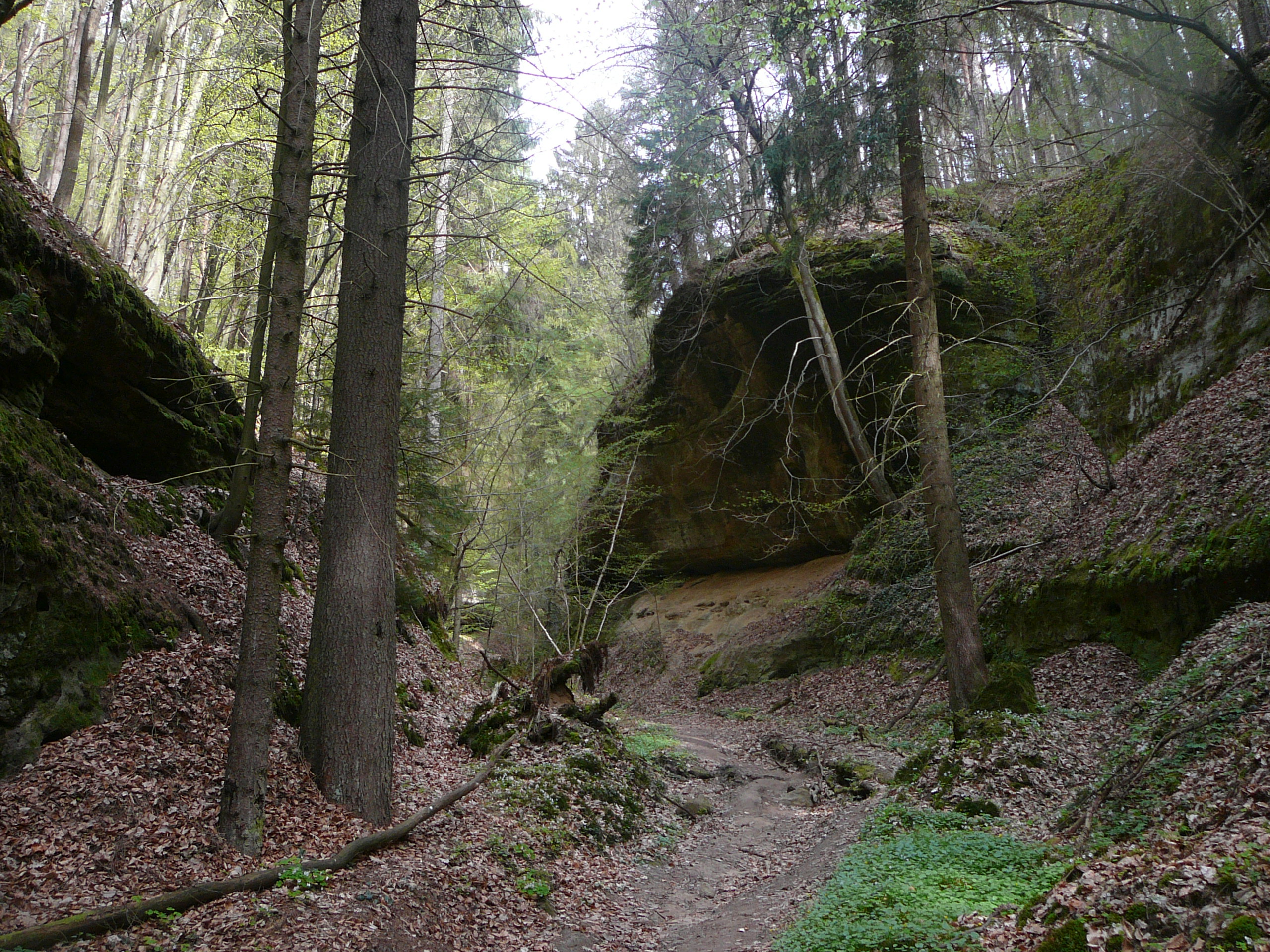 Ze Mšena vyražte na jihozápad po značené cyklostezce, ovšem hned po dvou kilometrech, v obci Hradsko, se napojte na turistickou červenou značku, která vás zavede skoro až ke Kokořínu. Cesta je to technicky náročná a občas kole povedete, ale vězte, že je to z celého výletu ta nejdobrodružnější část. Pěšina se vine mezi skalními masívy, které dosahují do výšky možná 30 metrů a jsou jich tu desítky, občas dokonce celý obzor opticky uzavřou. Stromu tu dosahují až do nepřirozených výšek. Myslím, že jsem nikde neviděl vyšší smrky než právě tady. Po jarních bouřkách se po cestě občas povalují padlé větve a někdy i celé stromy, ale to na kráse rozhodně neubere. Po čtyřech kilometrech dorazíte do útulné vesničky Kokořínský důl, kterou kromě roubenek krášlí i hospoda U grobiána, nádherná letní terasa s těmi žlutočervenými dřevěným židličkami, jaké pamatujeme z předlistopadové éry, výborná kuchyně, na výběr možná z deseti hotovek a na čepu Prazdroj a místní Podkováň. Ideální místo pro načerpání dalších sil.