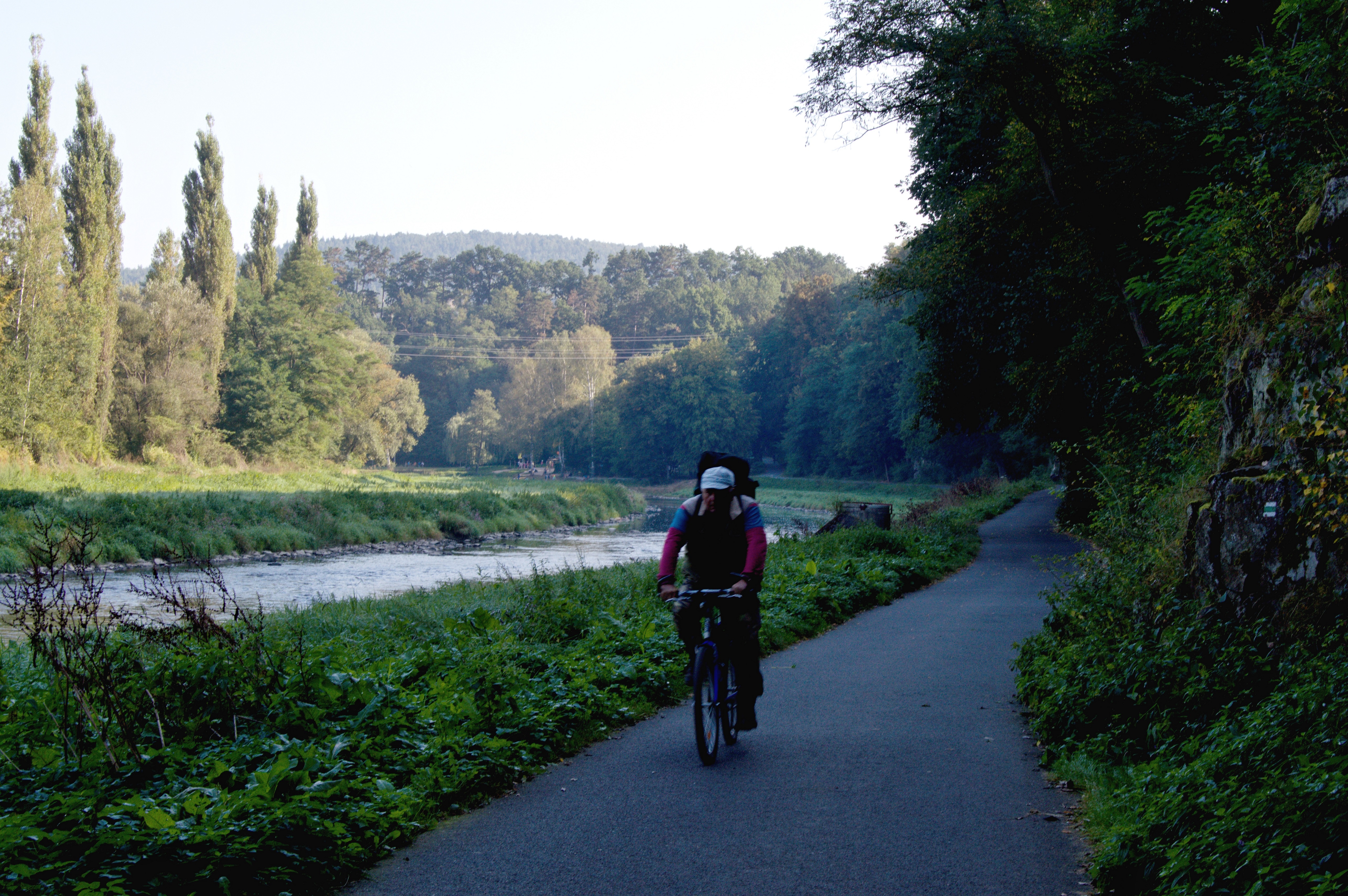 Ale vzhůru do sedel, od roku 2006 je Sedláčkova stezka, v modifikované trase o délce 35 km, zrenovována jako cyklostezka č. 1225 a tak se jí podíváme na zoubek. Prvních pět kilometrů vede při pravém břehu Otavy, tedy víceméně po rovince, navíc je tu stezka z větší části vyasfaltovaná, takže opravdu pohodička. Řeka je tu příjemně divoká, trošku zvlněná a čistá, což láká rybáře a koupače. Tahle idylka končí po pěti kilometrech, kdy se musíte dostat na druhý břeh, k čemuž slouží Plynová lávka. Původně tu zřejmě vedl plynovod a lávka po stranách potrubí je taková přidaná hodnota, ale jak říká Rudolf Hrušínský ve filmu Adéla ještě nevečeřela: ,, co bysme neudělali pro tůristi´´. Od lávky se začíná stezka vlnit i vertikálně a začíná tak cyklisticky nejkrásnější úsek cesty. Řeku opustíte, což je sice z estetického hlediska škoda, ale zase se zbavíte rybářů a koupačů, a navíc vjedete do lesa. Ten je docela mimořádný, je tvořen směsí modřínů, smrků, borovic, habrů a lip, což je celkem unikát, podobné složení lesa jinde než u Otavy nenajdete. Skončí i asfalt (až na dva kratičké úseky) a začne příjemná lesní šotolina, která vás dovede až do Varvažova. Před pár lety by asi nikoho nenapadlo, že vesnická památková zóna, se statky ve stylu lidového baroka, ale i krásným barokním kostelem a zámkem bude místem, kde se odehraje příběh, podle mého soudu nejlepšího českého westernu, (myslím tím film, kde kladný hrdina bojuje proti přesile podlých a všehoschopných lumpů), ale stalo se. Snímek Je třeba zabít Sekala se natáčel právě zde. Na návsi je navíc skvělá hospůdka, takže Varvažov za návštěvu rozhodně stojí.