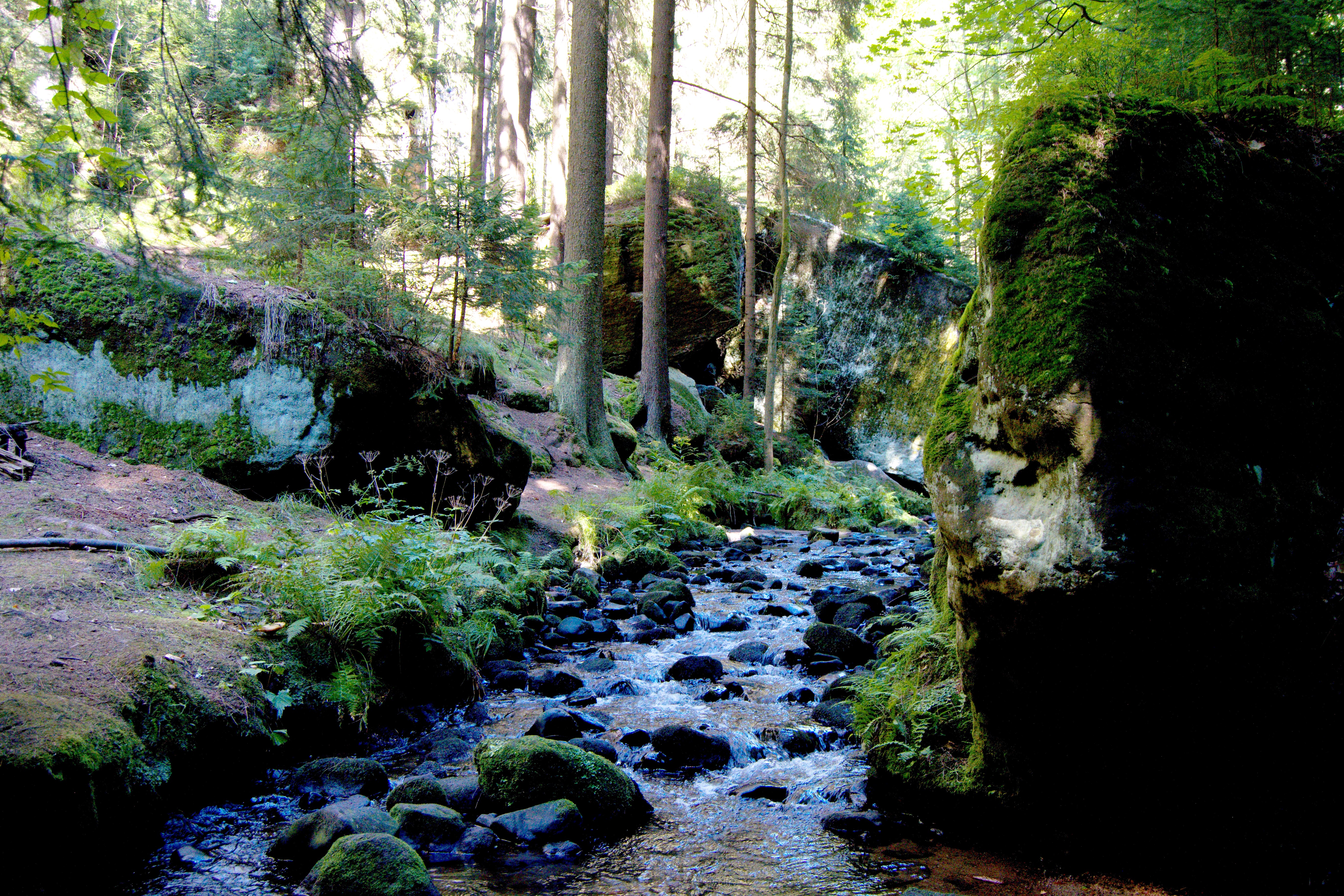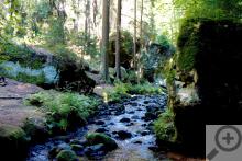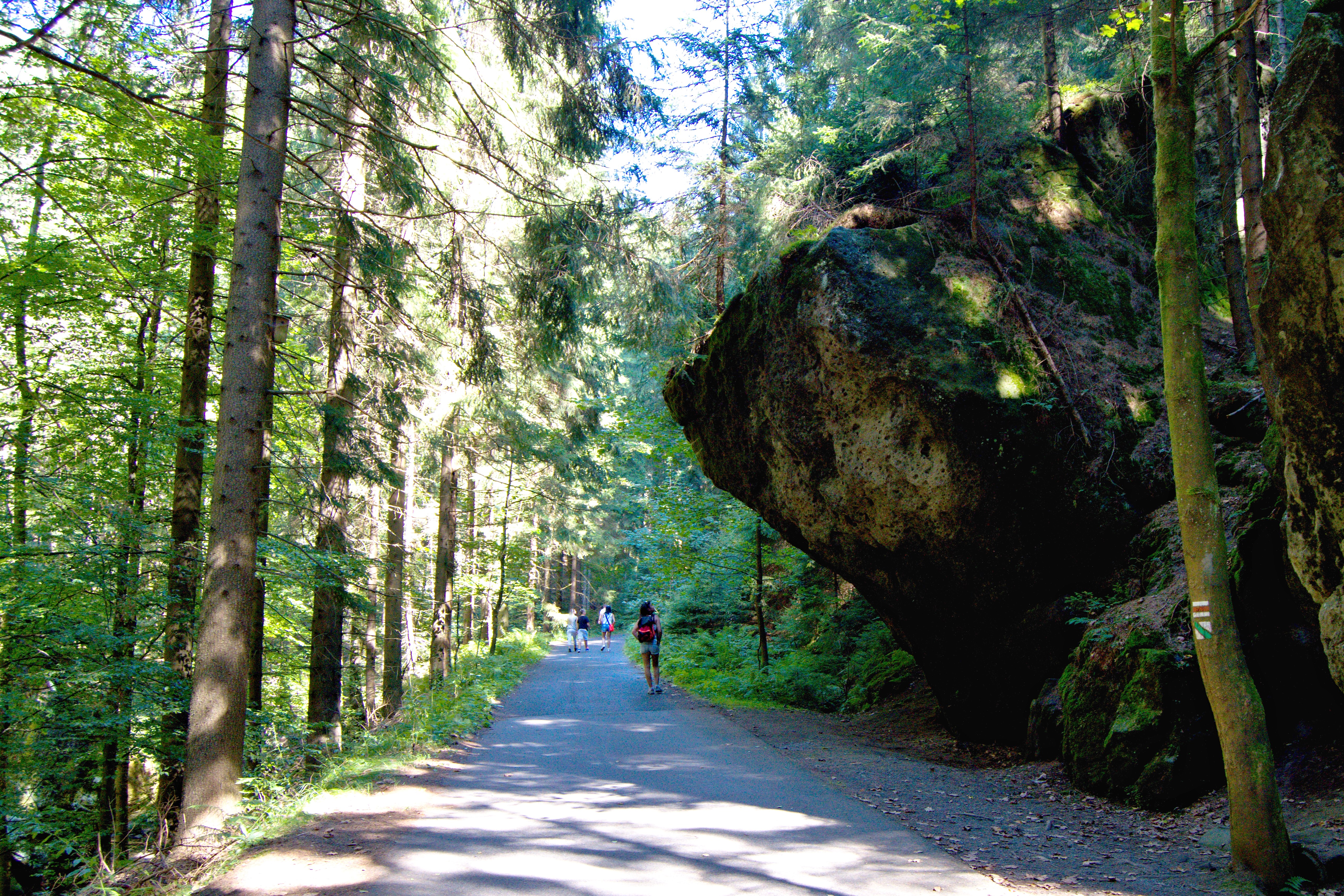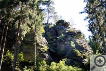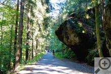 Ze Šluknova se vydejte po cyklostezce 211 na jih, směrem na Čítkův mlýn (na sever vede tato cyklostezka do Německa, kde navazuje na německé značení), tam uhněte po turistické červené doprava na Kunratice a vyjedete před nádherným arboretem, ve kterém je na 200 druhů dřevin a které bylo v době mé návštěvy volně přístupné (nevím, jestli to je tak vždycky). Pokračujte po červené na Brtníky a v případě, že byste se potřebovali najíst či napít, zajeďte do zdejší restaurace U Krkovičky (dal jsem si tu oběd a byl vynikající). Další osadou na trase je Kopec, při jehož návštěvě zažijete jinde nevídanou geograficko - fyzikální anomálii, která spočívá v tom, že ač jedete z kopce, jedete zároveň i do Kopce. Obě osady (Brtníky i Kopec) jsou velice půvabné, přičemž jejich krásu vytváří kombinace zajímavých a krásně upravených chalup zasazených do prostředí, které se vyznačuje až neskutečně intenzivním klidem. Kousek za Kopcem začíná Národní park Česko Saské Švýcarsko, což poznáte podle značky a hned několika příjemných změn. Zaprvé definitivně zmizí z cesty auta, zadruhé se objeví pískovcové skály nejrůznějších rozměrů a tvarů a zatřetí (což je celkem překvapení) nepřibude, možná dokonce ubude i turistů (především motorkářů). Je to asi tím, že část Česko Saského Švýcarska okolo Hřenska jich pojme tolik, že sem už (ke své vlastní škodě) nedorazí. Dalších pět až sedm kilometrů vede cesta opravdovou divočinou. Asi jsem měl štěstí, ale potkal jsem všeho všudy dva cyklisty, takže jsem si mohl užít klid, po jakém většina touží a kolikrát za ním putuje i mnohem dál, než je třeba.