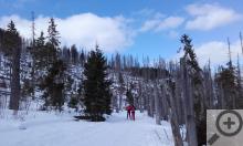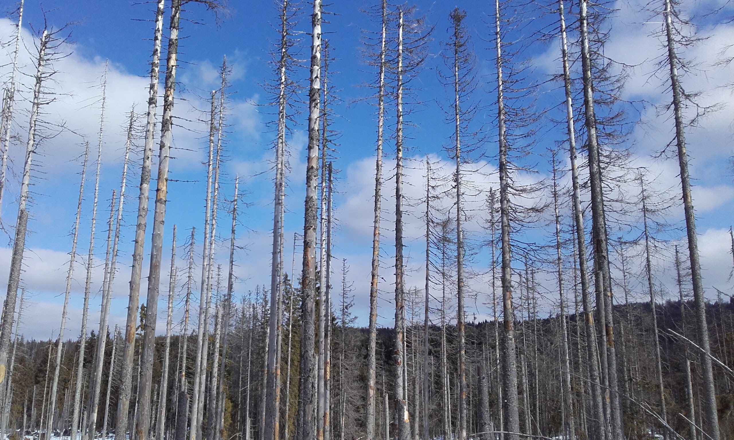 Nadále opusťte osídlení a vydejte se do kopců za pravou šumavskou divočinou. Připravte se ovšem na nejdříve pozvolnou, ale po čase razantní proměnu šumavské přírody. V neprostupných lesích se začne objevovat současná bolest Šumavy. K torzům stromů, tyčících se seschle a bez větví k nebi, není třeba cokoli dodávat. Nechte však tato místa na sebe působit. Než dojedete k dalšímu bodu trasy, bude dost času popřemýšlet o vztahu „lidská činnost – příroda“. Další zastávka je o dost veselejší, ač suché stromy nezmizí. Jedná se o malý dřevěný pomníček nad studánkou pokrytou sněhem. Zavřete oči a z dálky to možná uslyšíte. Ty první tóny známé symfonické básně Bedřicha Smetany. Ano, jste u pramenů Vltavy. Není lehké si zde představit, že z tohoto pramínku se stane ona majestátní řeka protékající Prahou.